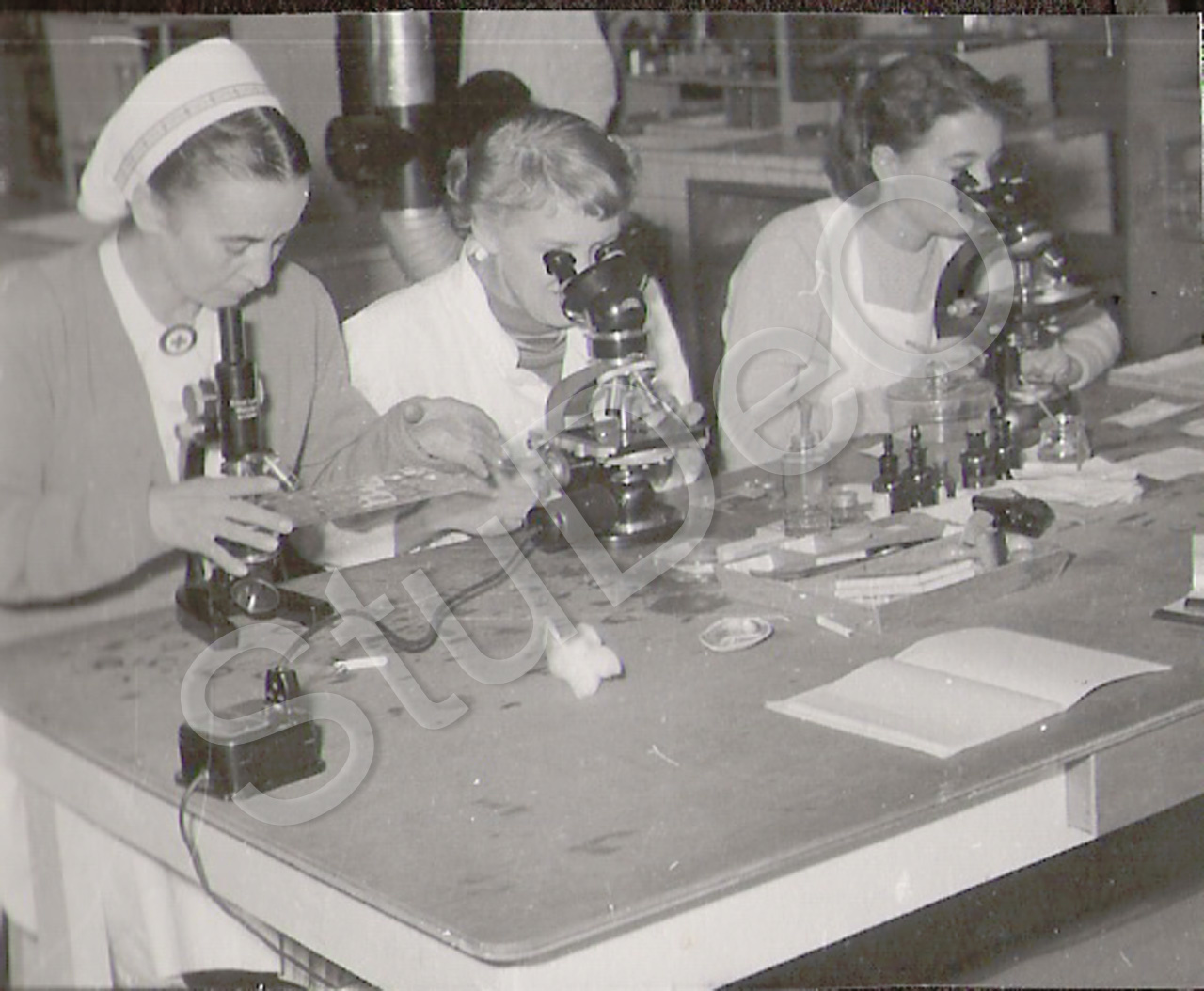 Beschreibung: Labor im Rote Kreuz Hospital Pusan. Schwestern und Ärztin bei Mikroskopuntersuchungen.