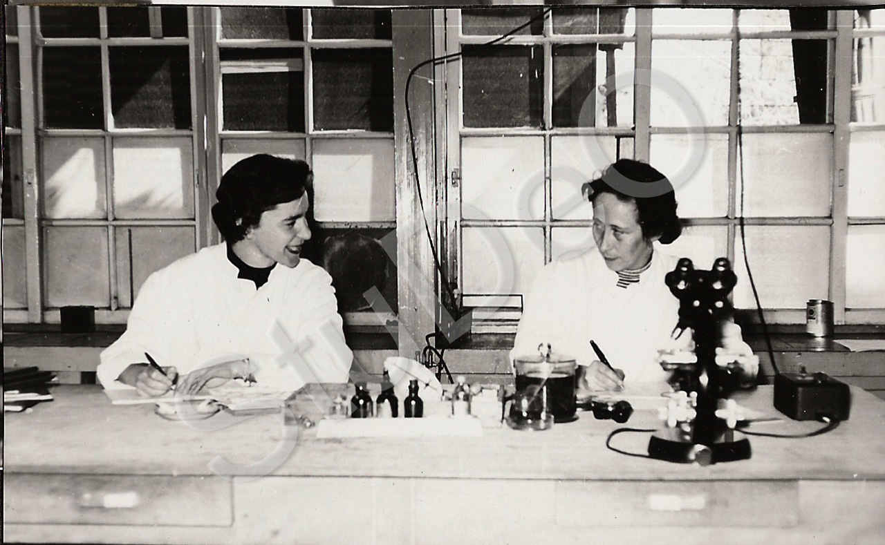 Beschreibung: Ärztinnen  im Labor im Rote Kreuz Hospital Pusan. Frl. Dietrichs, Frl. Popp.
