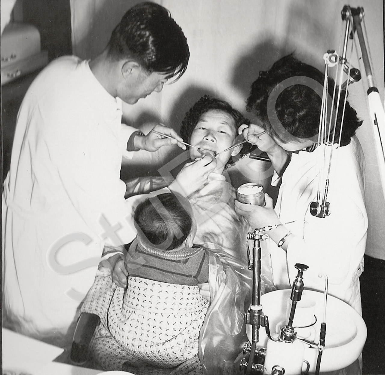 Beschreibung: Patientin beim Zahnarzt im Rote Kreuz Hospital Pusan, hat ihr Kleinkind auf dem Schoß.