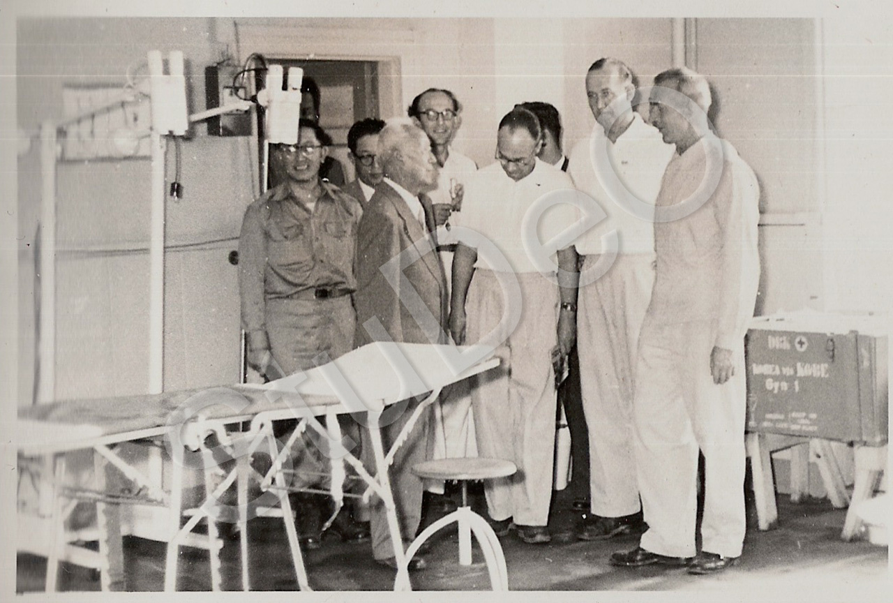 Beschreibung: Der koreanische Staats­präsident Syngman Rhee besucht mit Ärzten Räume im Deutschen Rote Kreuz Hospital.