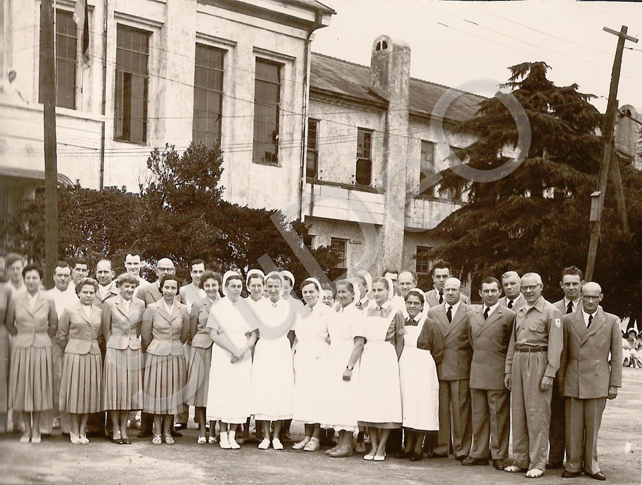 Beschreibung: Deutsche Ärzte und Schwestern vor dem Deut­schen Rote Kreuz Hospi­tal.