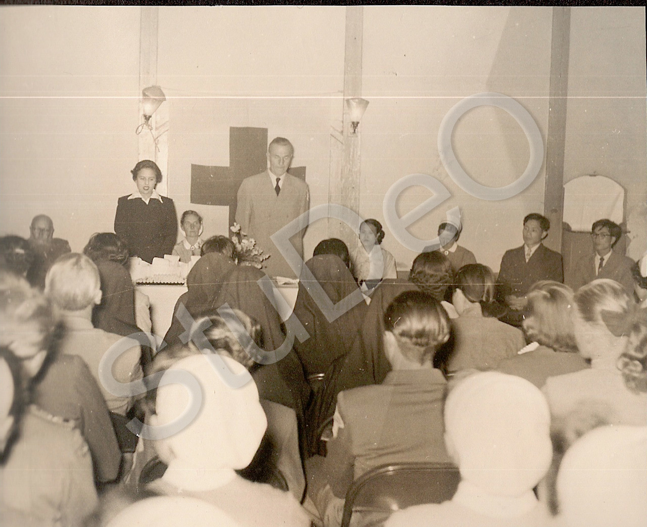 Beschreibung: Prof. Günther Huwer bei einer Versammlung in einer Halle des Deut­schen Rote Kreuz Hospi­tals.