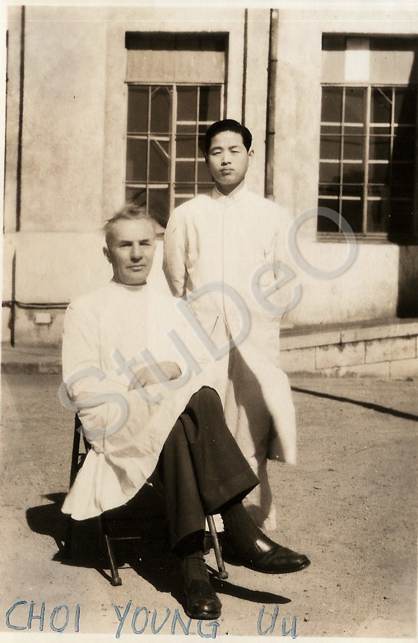Beschreibung: Prof. Günther Huwer (sitzend) mit koreanischem Arzt Choi Young Uu, vor dem Rote Kreuz Hospital Pusan.