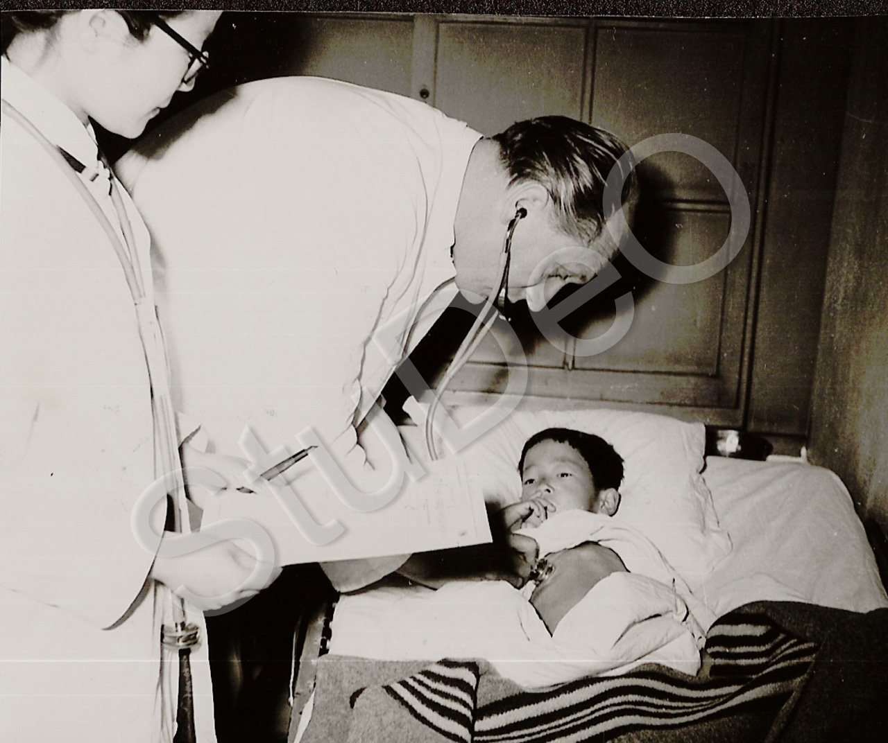 Beschreibung: Arzt untersucht Kleinkind im Kindersaal des Rote Kreuz Hospitals Pusan.