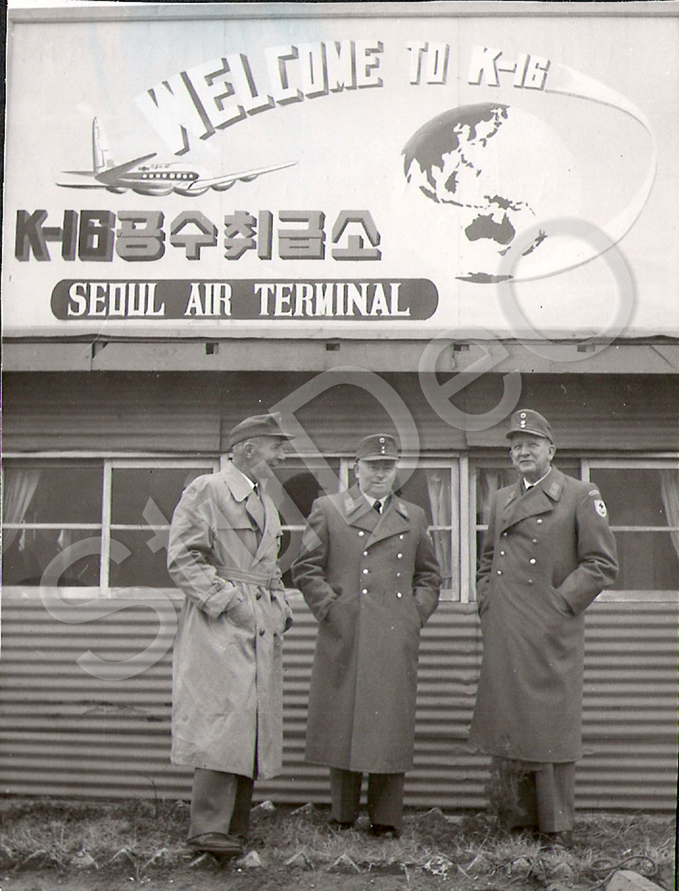Beschreibung: Prof. Günther Huwer und zwei Ärzte vom Deutschen Rote Kreuz Hos­pi­tal Pusan am Flughafen Seoul.