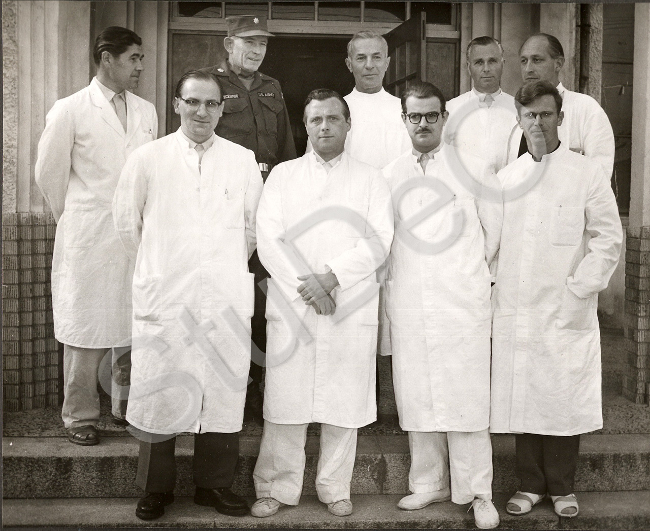Beschreibung: Prof. Günther Huwer (hinten Mitte) mit seinem deutschen Ärzteteam. Dr. Friedrichs (li.), Dr. Hage (vorne 2.v.re.).