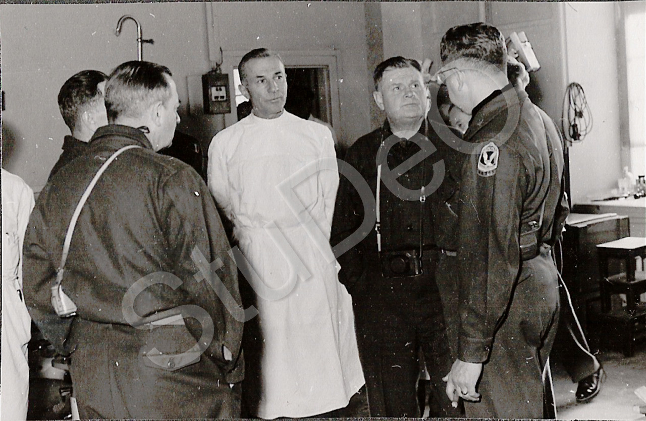 Beschreibung: Prof. Günther Huwer, Deut­sches Rote Kreuz Hospital Pusan, und 4* Ge­neral Armstrong (beide nach vorne guckend) mit Offizieren im Gespräch.