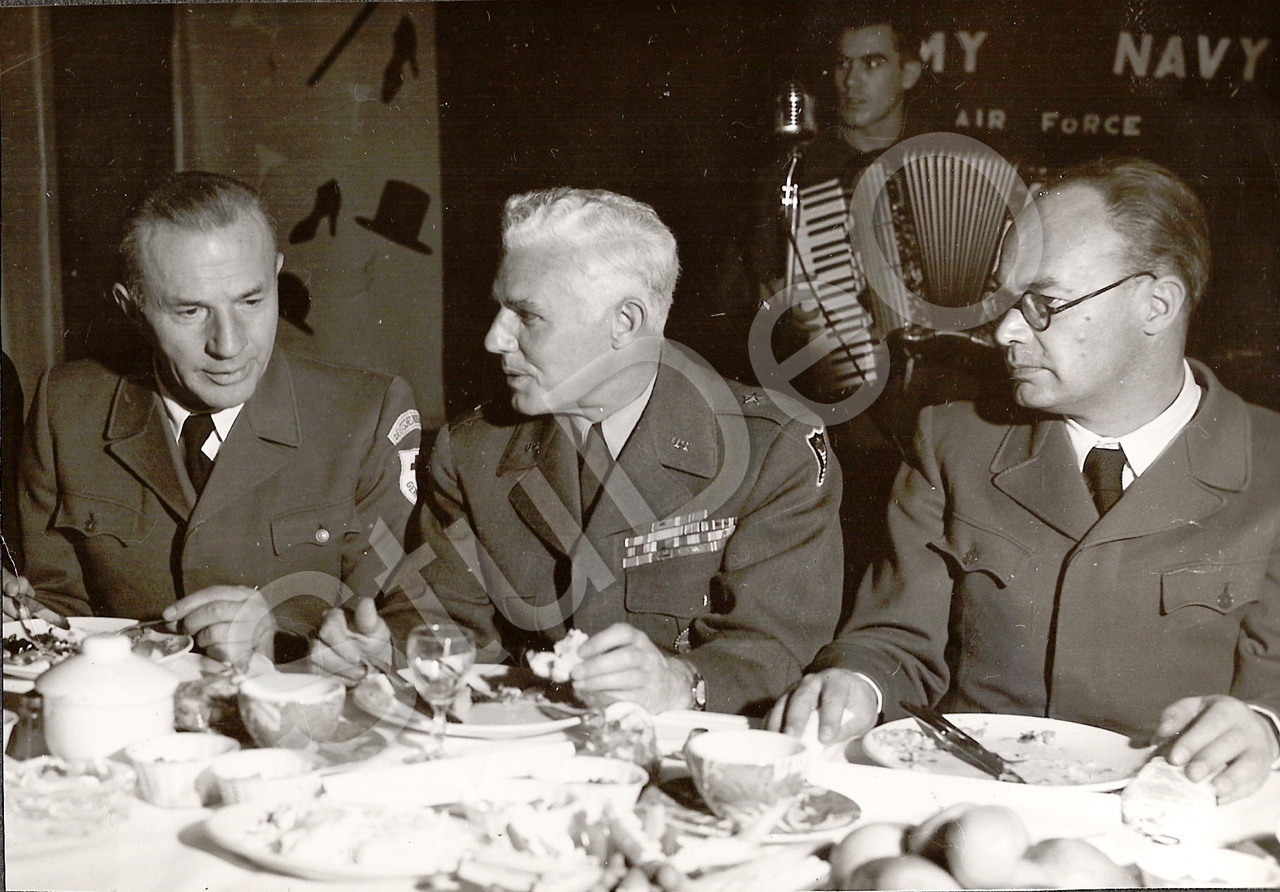 Beschreibung: Prof. Günther Huwer (li.) und andere Ärzte (re.) des Deut­schen Rote Kreuz Hos­pitals Pusan, besuchen die  US Army.  In der Mitte General Norman Vissering.
