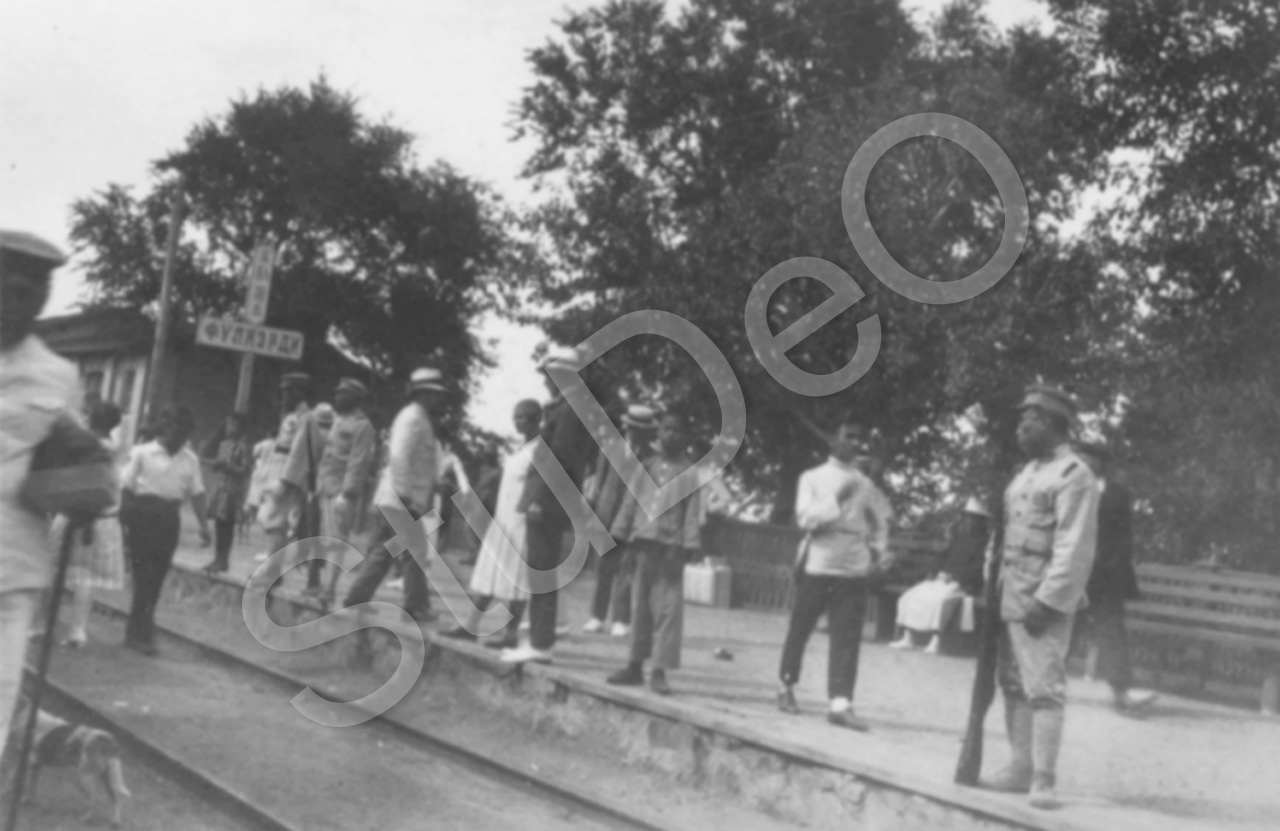 Beschreibung: Am Bahnsteig vermutlich in Harbin, bei der Rückreise nach China mit der Transsibirischen Bahn. Soldaten mit Gewehren.