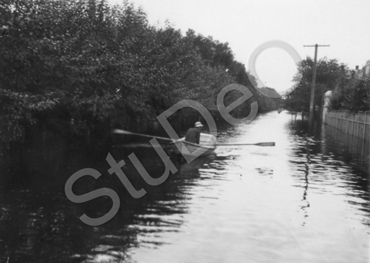 Beschreibung: Überschwemmte Straße als Fluß angeschwollen.
