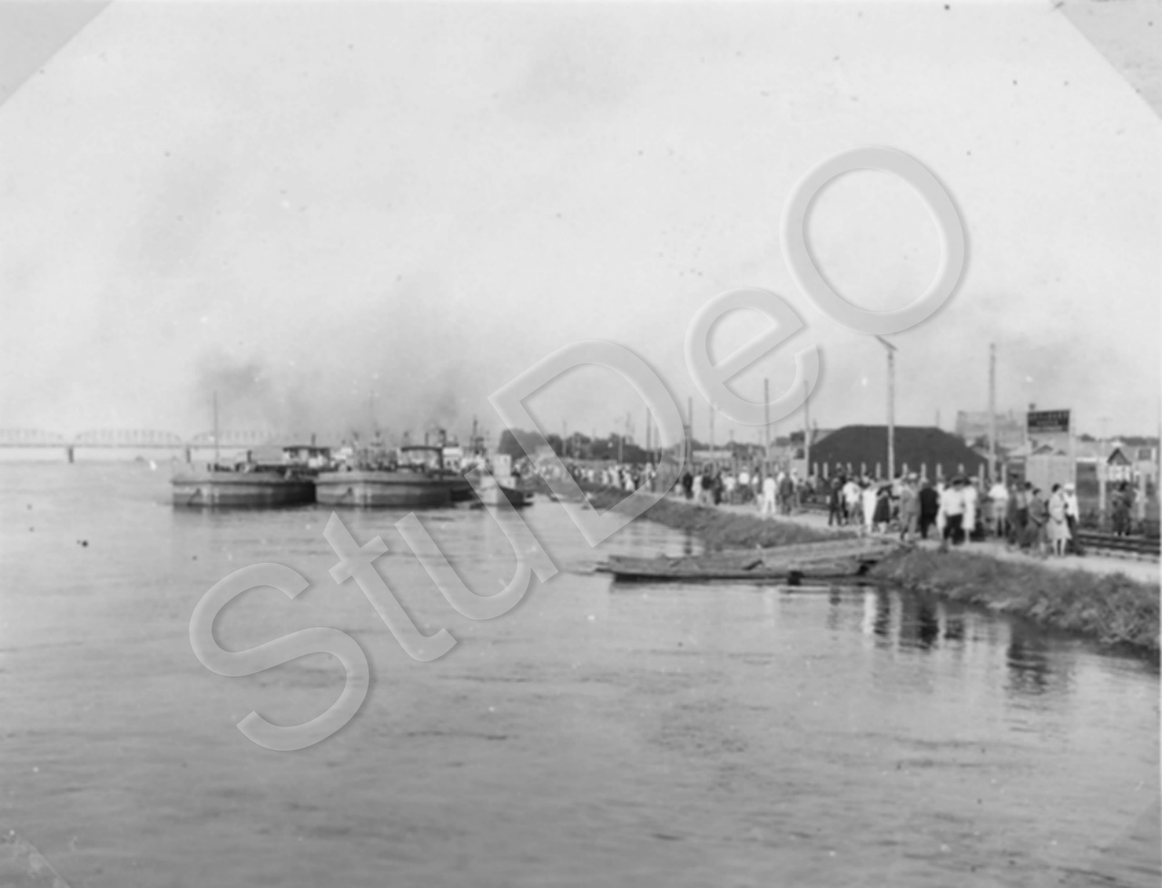 Beschreibung: Am Hafen vom Sungari aus gesehen. Schiffe zwischen dem Hafenteil in Foto P6382 und der Eisanbahnbrücke, die im Hintergrund sichtbar ist.