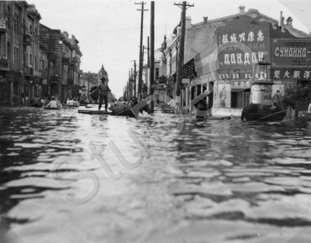Beschreibung: Boote und Pferdekarren auf stark überschwemmter Mostovaya/Kitaiskaja Str.