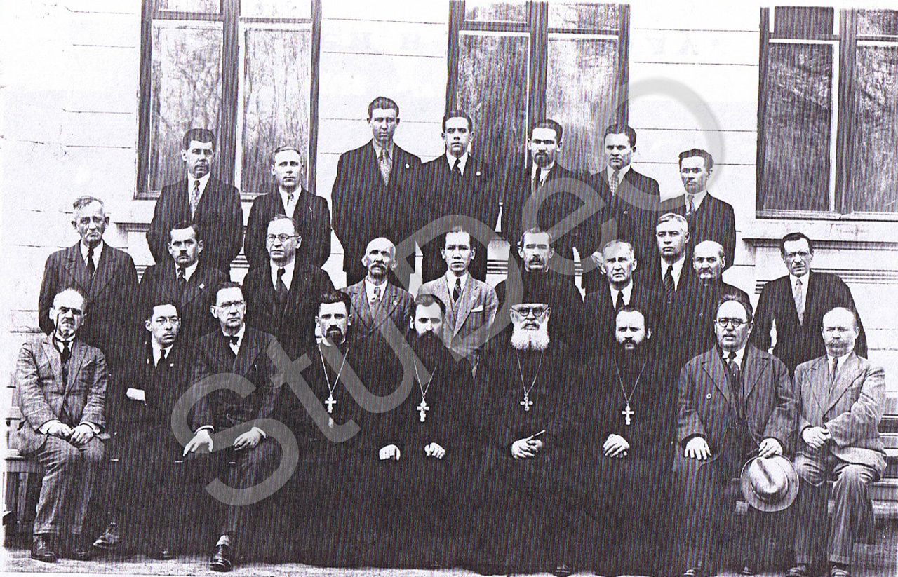 Beschreibung: Priestermönche der orthodoxen Kirche und zivile Lehrer am russischen Knabenlyzeum des HL. Nikolaus in Harbin. Nach dem II WK besuchten auch wenige Deutsche Kinder diese Schule. Manuskript *1507.