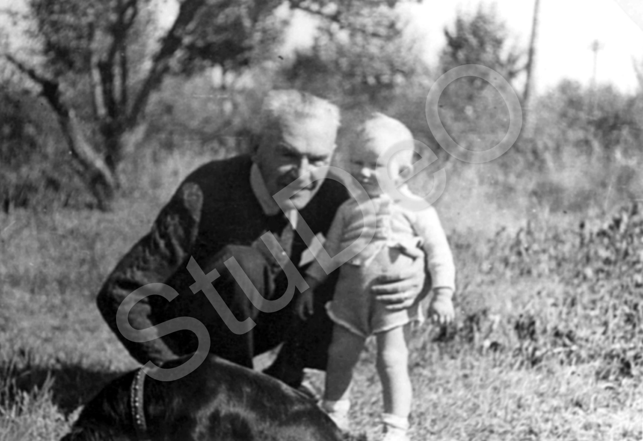Beschreibung: Gudrun Emme mit Opa Johannes Peter Wormsbecher im Frühjahr 1943 im Garten seines Hauses.