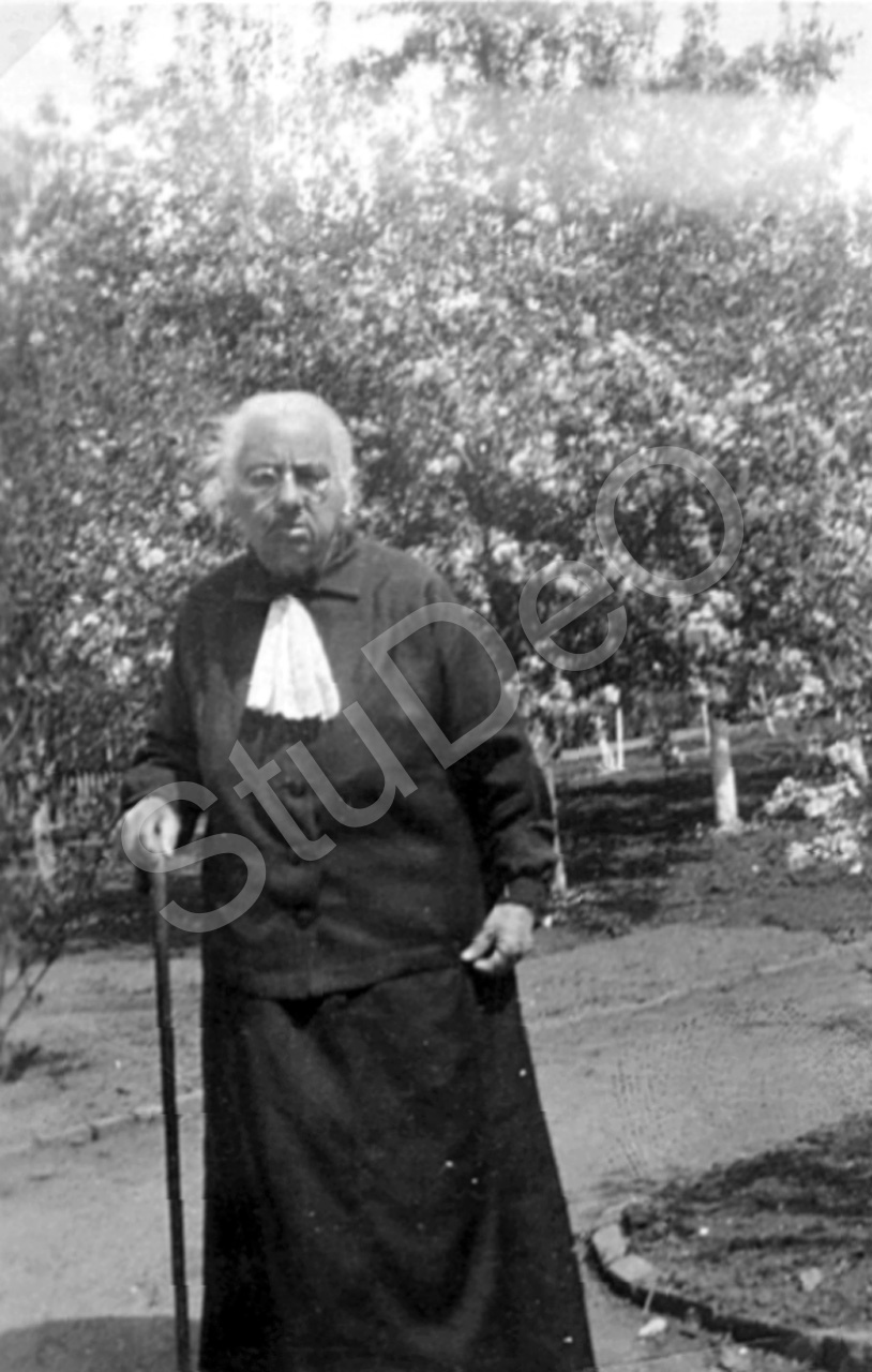 Beschreibung: Eudokia Michailova, Mutter von Ludmilla (alte Dame mit Stock im Garten).
