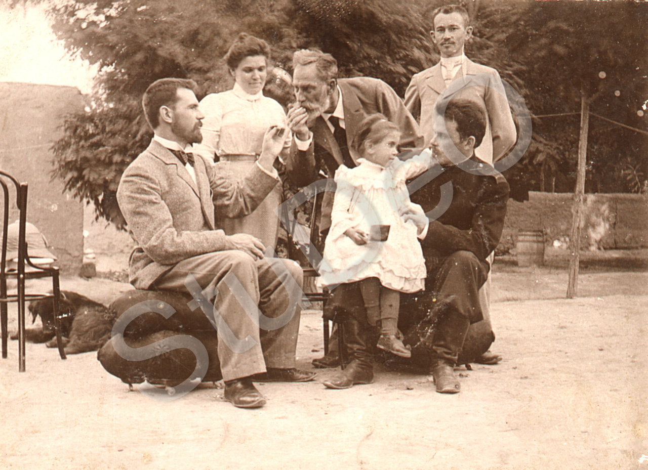 Beschreibung: Heinrich Wormsbecher (ganz links), daneben Valerie, Tochter aus erster Ehe von seinem Bruder Johannes Peter Wormsbecher, sich bückend: Freund Willy Scharrmann.