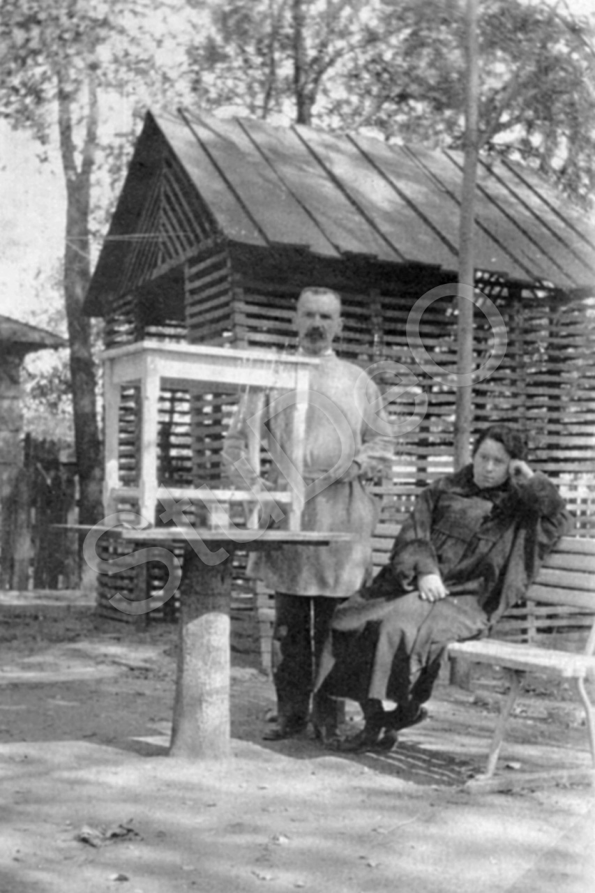 Beschreibung: Johannes Peter beim Streichen eines Holztisches und Ludmilla Wormsbecher im Garten.