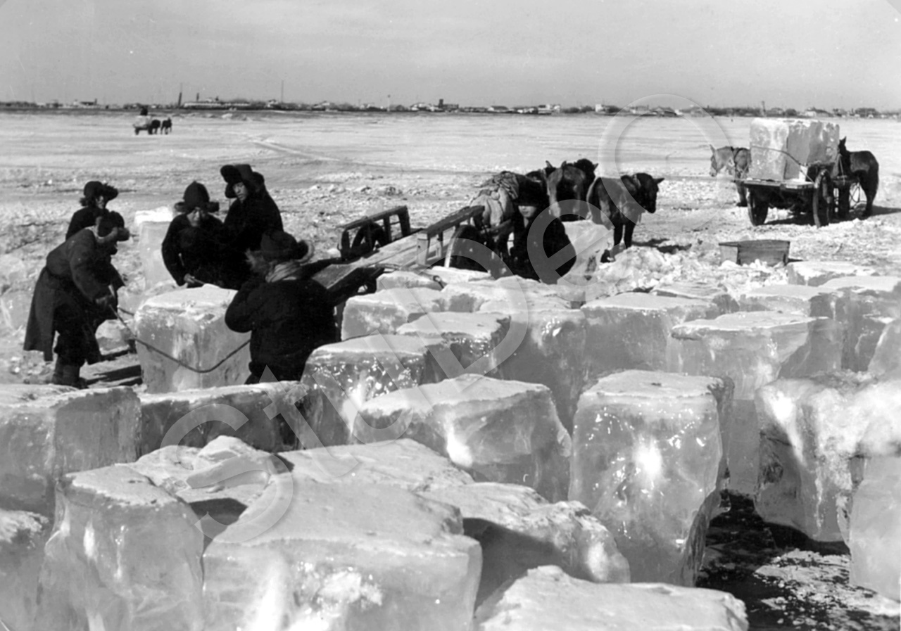 Beschreibung: „Die Chinesen sägten Eisblöcke aus dem Sungari-Fluss. Diese wurden in riesige, mit Strohmatten isolierte Höhlen oder Hallen gestapelt, die während der ganzen warmen Jahreszeit so als Kühlräume dienten“.