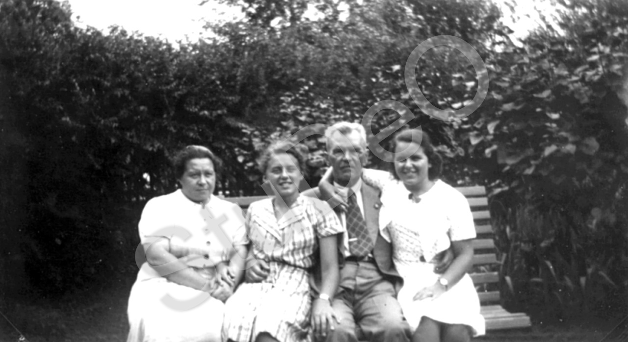 Beschreibung: Familie Wormsbecher auf einer Bank im Grünen. Von links: Ludmilla, Elvira, Johannes Peter, Olga.