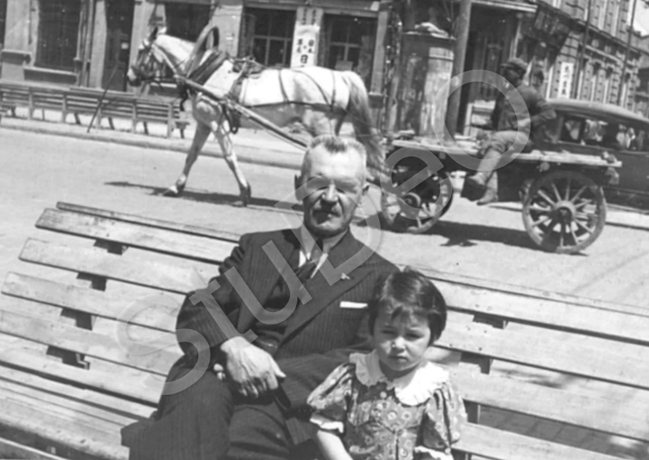 Beschreibung: Johannes Peter Wormsbecher mit etwa 3jährigen Sohn vom Koch des Hauses (Elvira nannte ihn Ping-Ssen), auf einer Bank an einer Verkehrs­straße in Harbin.