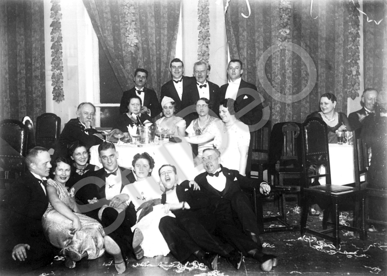 Beschreibung: „Eines der häufigen Feste (Faschingsball?) in Harbin“, zu fortgeschrit­tener Stunde, wohl im Deutschen Klub. Vorne am Boden sitzend in weißem Kleid Elvira Wormbecher, im Arm daneben Pastor Rosin. Hinten stehend 2. von rechts Johannes Peter Wormsbecher und am Tisch (hinter der Sektflasche) Ludmilla Wormsbecher, die Eltern von Elvira.