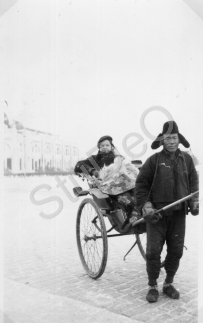 Beschreibung: Olga Wormsbecher in Harbin im Winter in der Ricksha.
