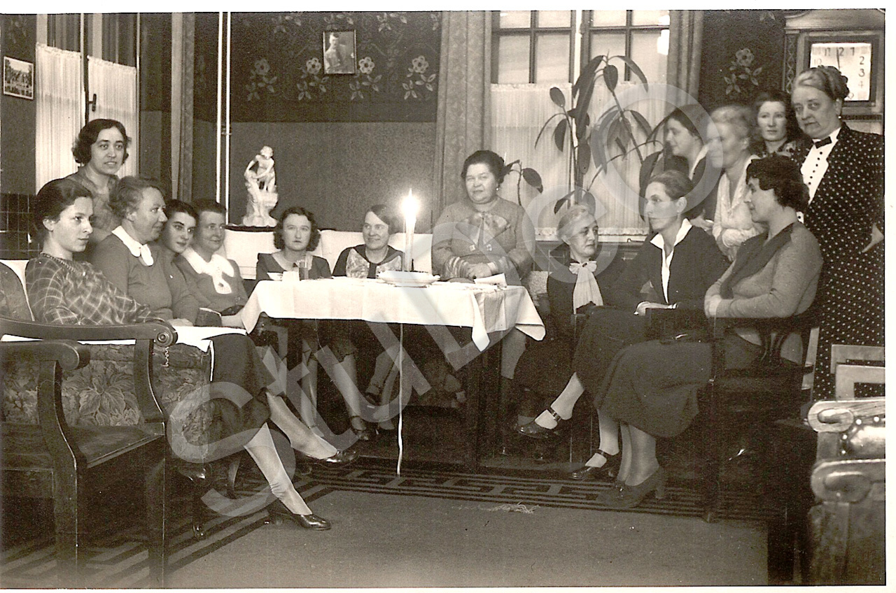 Beschreibung: Damen bei einer Zusammenkunft im Hotel Keining. Ganz li. Frau Kluge, 2. hinter Tisch Frau Bass, 3. Else Scharmüller-Harrs (ist mit Mann Hans seit 1929 Partner von Keinings), Frau Kürzel, ganz re. Marie Keining.