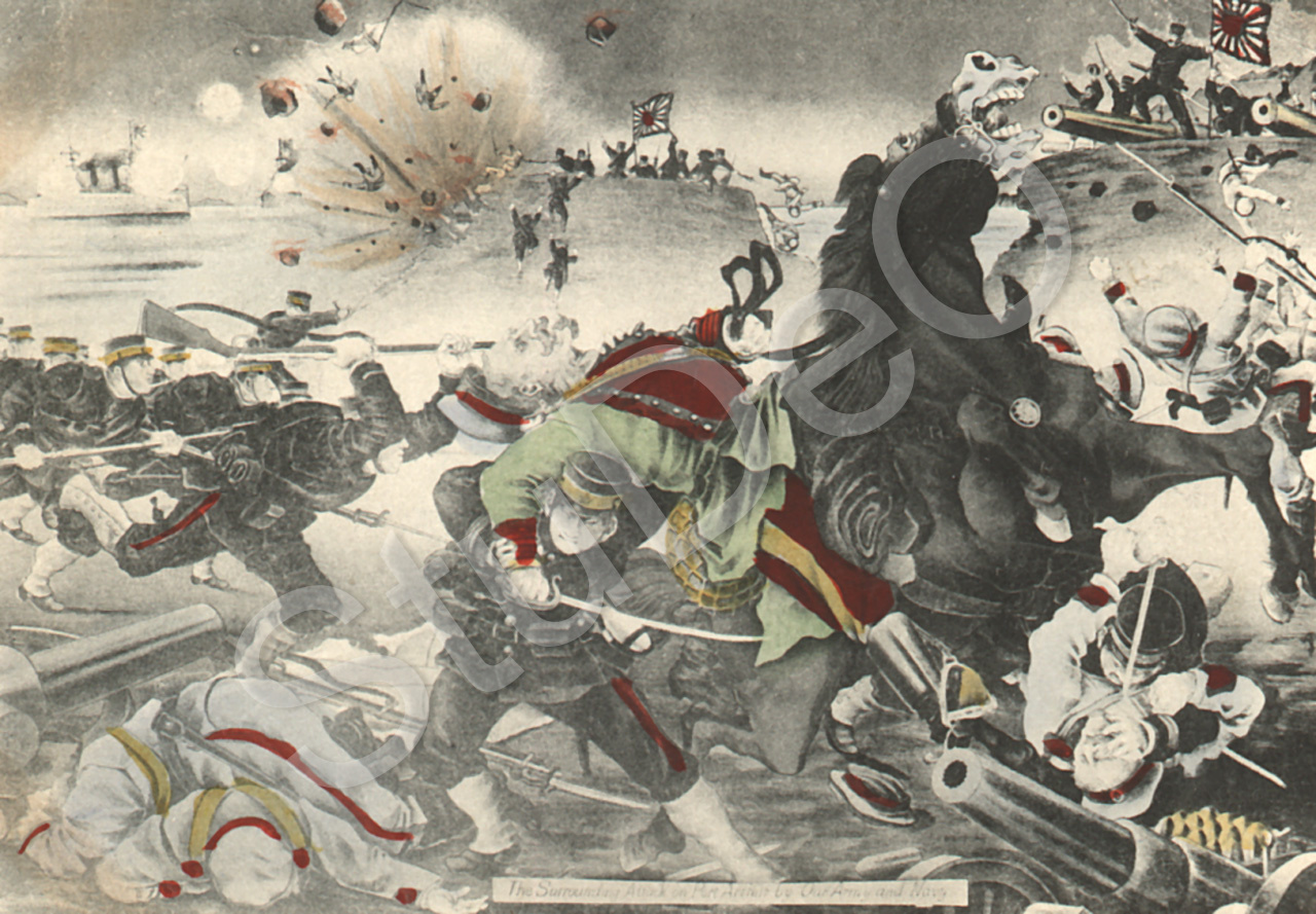 Beschreibung: Postkarte stellt eine Schlacht im Russisch-japanischen Krieg von 1904/05 dar, gemalt und mit englischer In­schrift: "The surrounding attack on Port Arthur by our Army and Navy" (Port Arthur/Dairen/Lüshun/Lüshunkou 旅順口區, Teil des heutigen Dalian 大連市, war eine russische Festung von 1898 bis 1905)