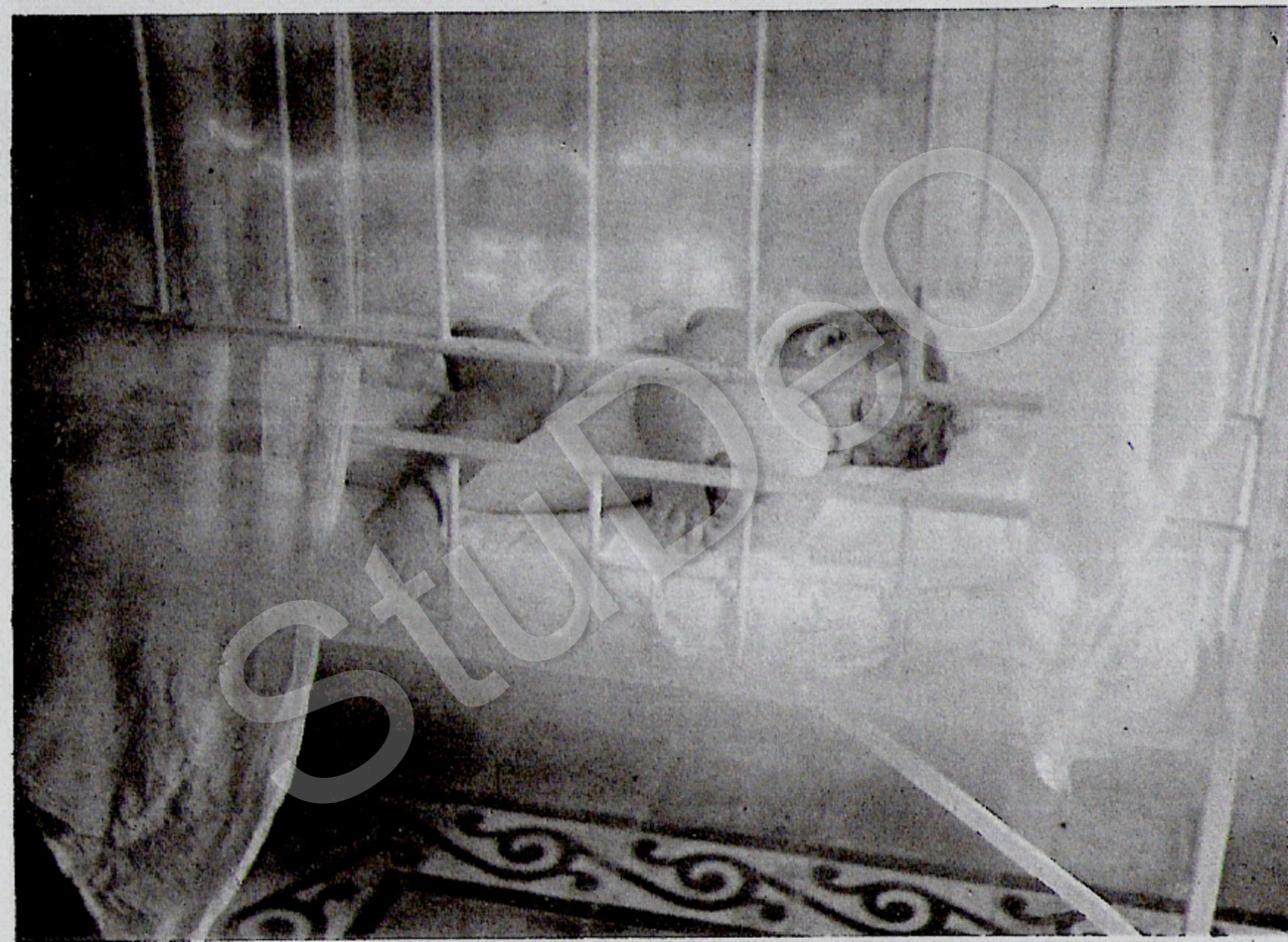 Beschreibung: Hanns, Sohn von Hans und Edda Hachgenei, im Gitterbett mit Klambu (Moskitonetz) und Guling (Schlummerrolle oder in den englischen Kolo­nien „Dutch wife“ genannt) in Batavia auf Java.