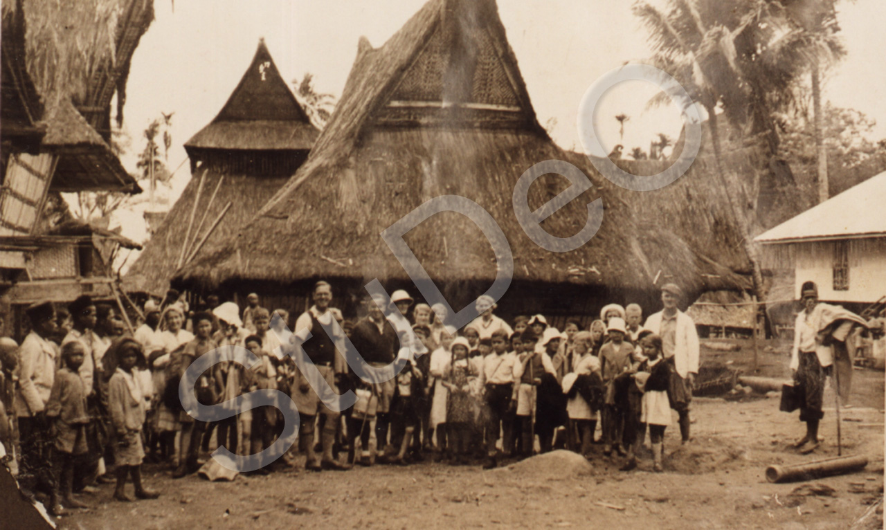 Beschreibung: In einem Batak Dorf bei einem Schulausflug in Kaban Djahe. U.a. Frl. Löwenstein, Poldi Lange, Turnlehrer Woehnert, Studienrat Heinz Reverey, Lehrerin Ellen Reverey, Gerda Zech, Ingeborg Lück, Brigitte Graske, Otto Behrens, Lehrer Volker (beliebt), Karl-Heinz Woltersdorf ,Ilse Lindenau. Nachtrag von Gerda Lück, Zwillingsschwester von Ingeborg: Frau Ellen Löwenstein war die Frau eines Missionsarztes, die nach seinem Tod als Hausdame in der Internatsschule in Kaban Djahe arbeitete. Die großen Ferien verbrachte sie auf der Tabakplantage der Familie Lück.