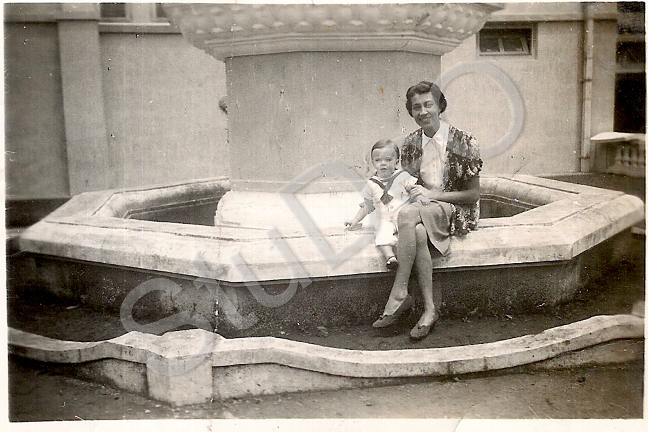 Beschreibung: Frau Haas mit Sohn Ernst im Internierungslager Salatiga, Java.
