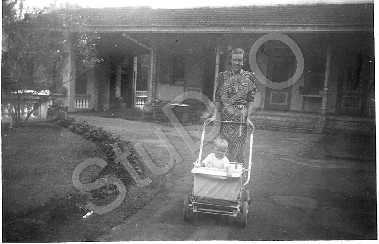 Beschreibung: Erika Denklau mit Tochter Dagmar im Kinderwagen, im Internierungslager Salatiga, Java.