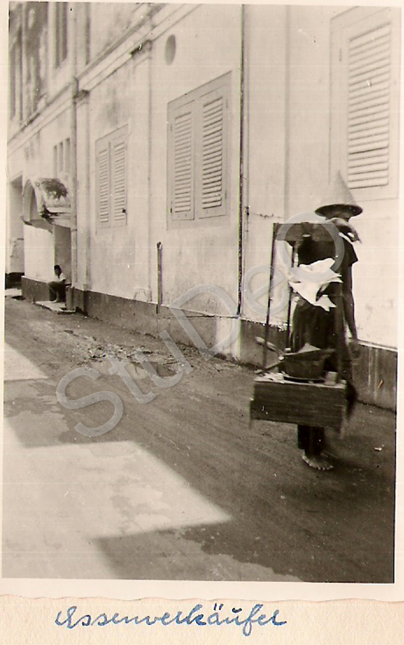 Beschreibung: Essenverkäufer in Surabaja. Hoch­zeits­reise A. und F. Mittag am 12.05.1954.