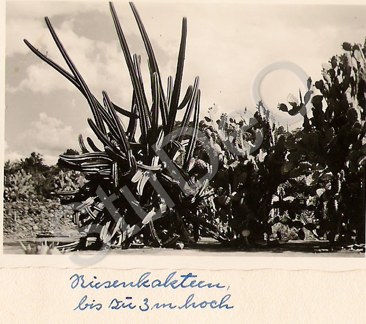 Beschreibung: Riesen Kakteen, sie werden bis zu 3 m hoch. Im botanischen Garten. Hoch­zeits­reise A. und F. Mittag am 19.05.1954.