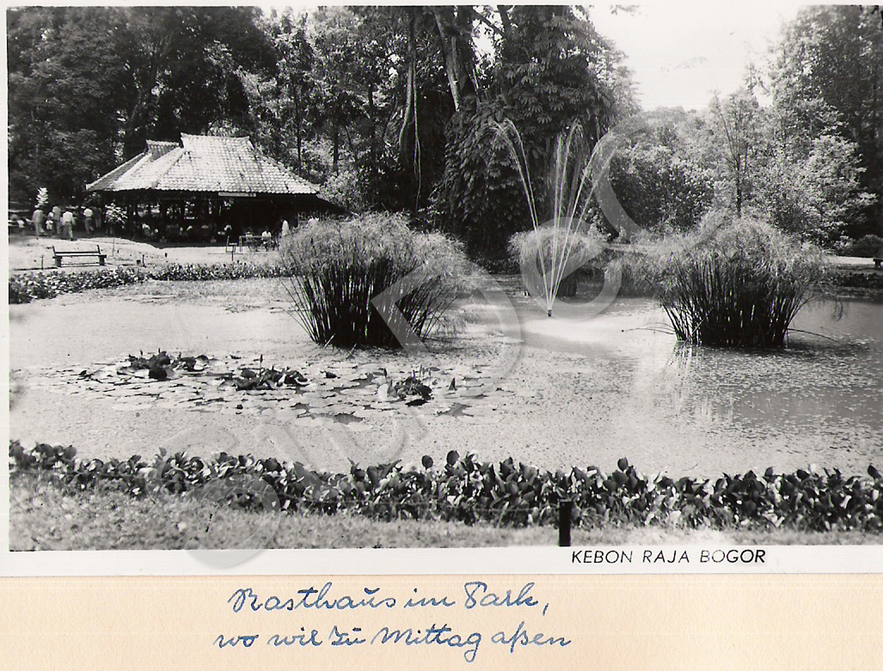 Beschreibung: Rasthaus im botanischen Garten. Hoch­zeits­reise A. und F. Mittag am 19.05.1954.