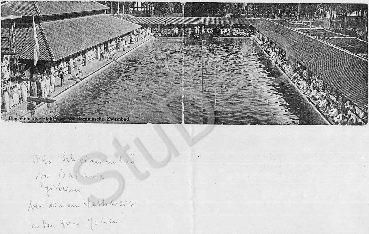 Beschreibung: Wettkampf im Schwimmbad Tyikini in Batavia.