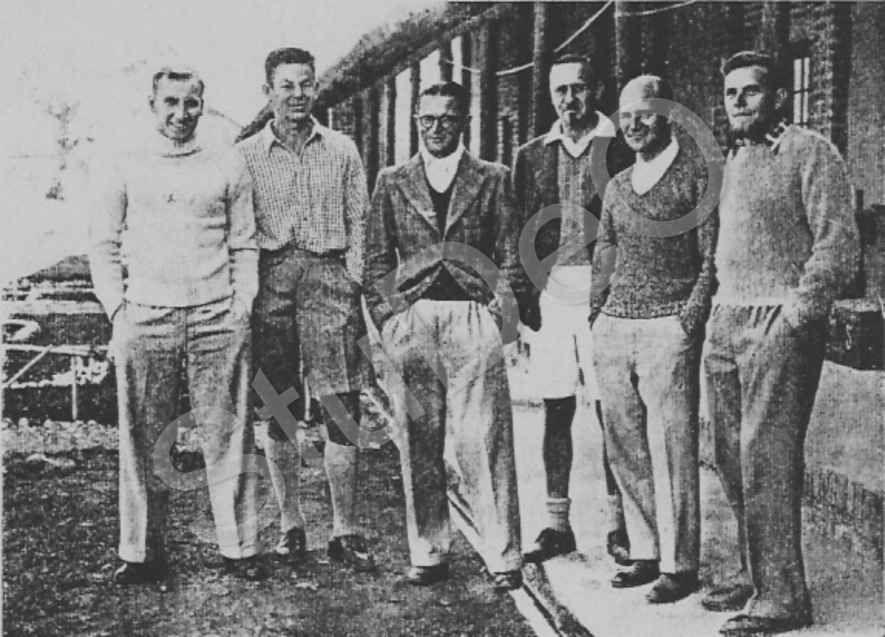 Beschreibung: Gruppenaufnahme von Gefangenen aus Niederländisch Indien im Lager Dehra Dun vor einer Baracke.
