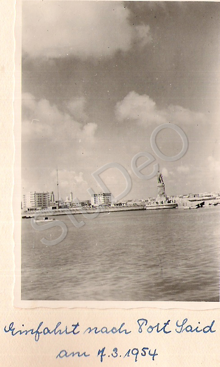 Beschreibung: Sicht der Stadt Ports Said bei der Einfahrt mit der M.S. Bremen. Denkmal Ferdinand de Lesseps. Hochzeitsreise von Anneliese und Fred Mittag.