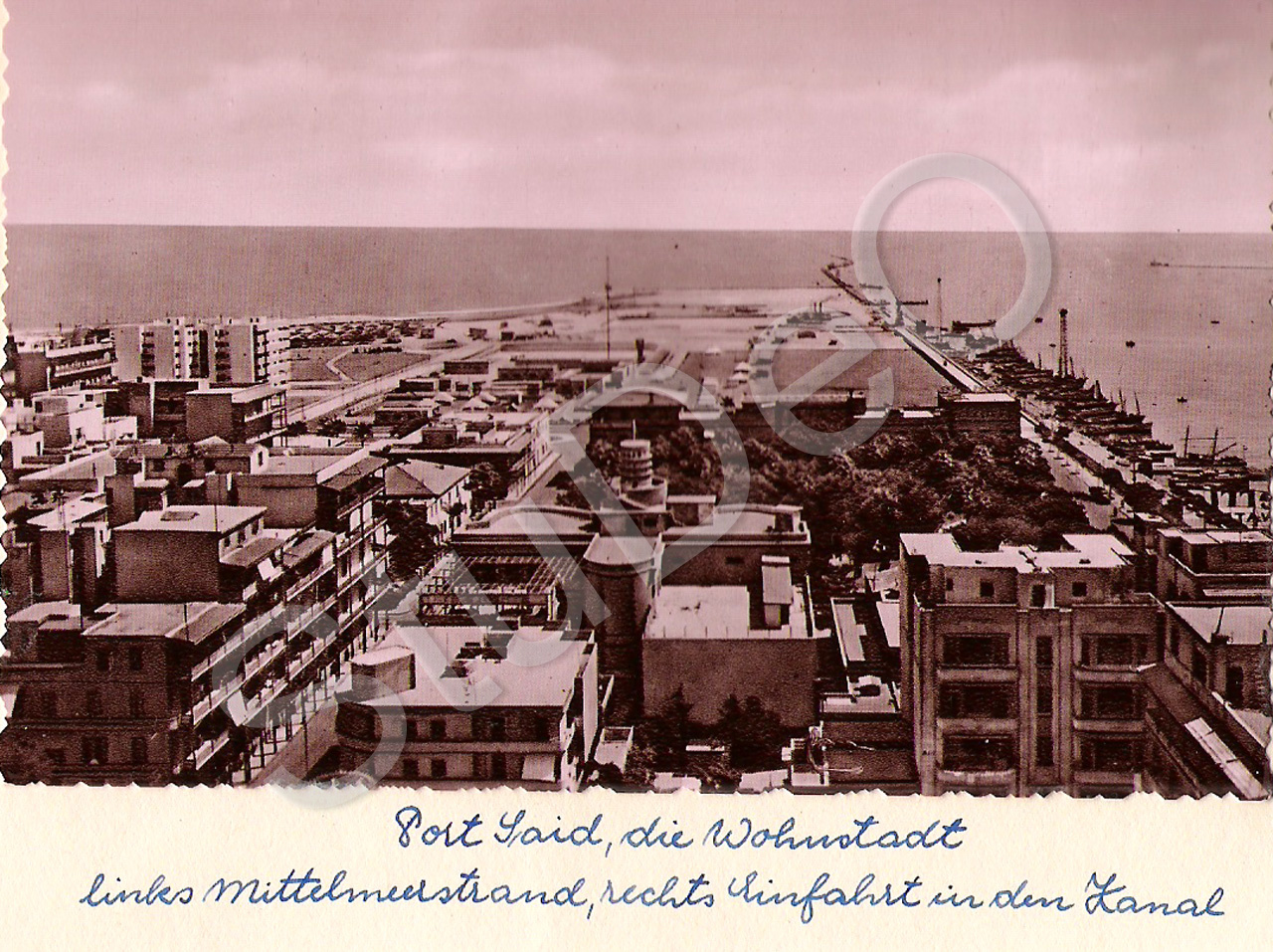 Beschreibung: Sicht auf den Wohnbereich der Stadt Ports Said. Links der Mittelmeer­strand, rechts Einfahrt in den Suezkanal. Hochzeitsreise A. und F. Mittag.